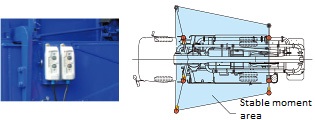 The front outrigger is the obliquely overhanging type which has larger stable moment areas by widening its overhanging area.