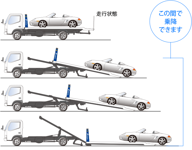 ボデーを地面まで降ろすことができ、車両の安全な積み込みと運搬をすることができるはたらく自動車です。