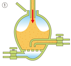 車に装備したコンプレッサからのエアをタンクに導き、粉粒体と混合してパイプの中を流れやすく(流動化)し、長距離・高所に粉粒体を排出できます。