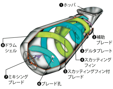 生コンクリートが固まらないようにかき混ぜながら運ぶことのできる、回転する大きなドラムを装備したはたらく自動車です。ドラムの内部には、らせん状ブレード(羽根)が付いており、ドラム回転によって、生コンクリートの材料(セメント、水、砂、砂利)が分離しないように撹拌(かくはん)できる構造になっています。