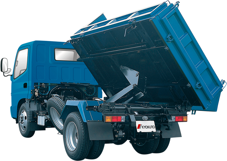 三方向にダンプできる三転ダンプ(写真右)、テールゲートが上開き式のフラッティゲート®付ダンプなどがあります。