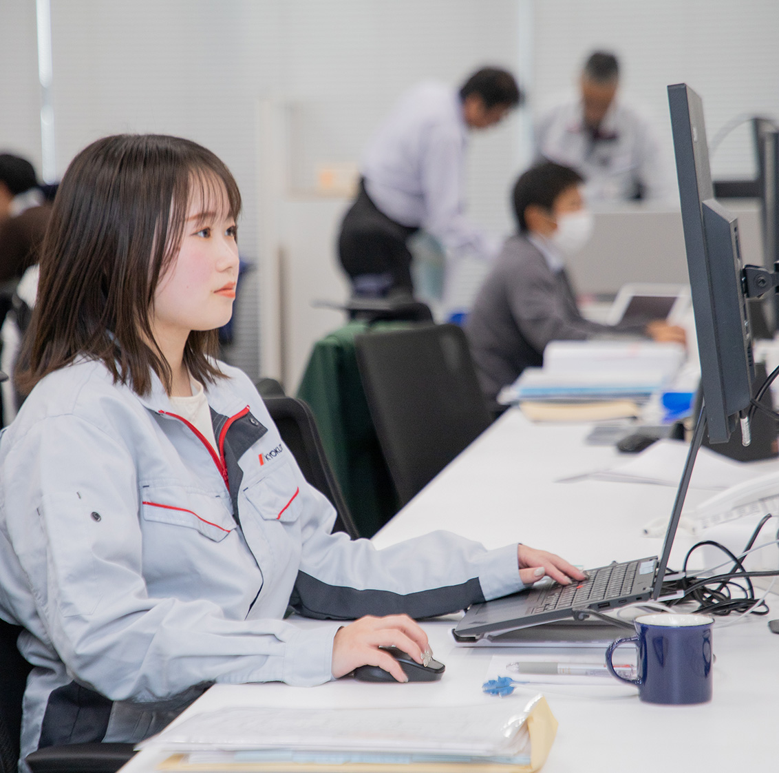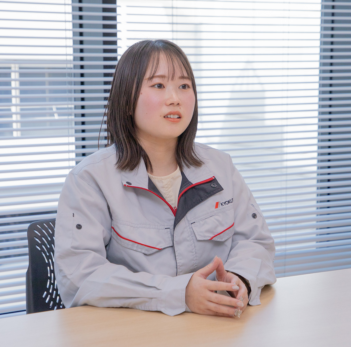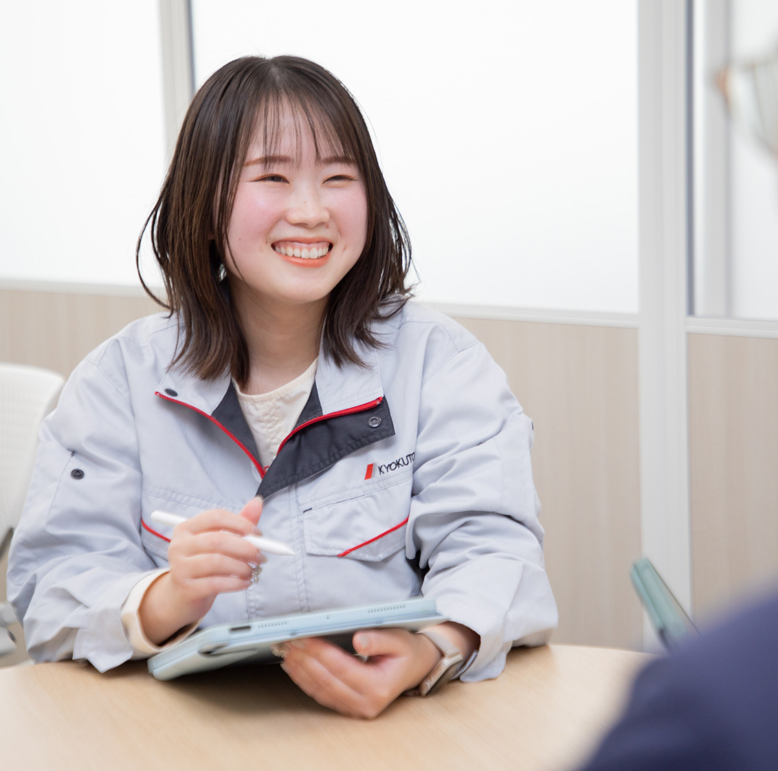 子どもの頃、テレビで見た建設会社のCMに感銘を受け、社会基盤を支える仕事に憧れを持ちました。「地図に残る仕事」への思いを胸に、高等専門学校では機械工学を専攻し、就職活動では学んだ知識を活かして夢を実現できる場所を探していました。そんな中、会社訪問で極東開発工業を訪れた際に目にしたのは、部長と若手社員が打ち解けて話す姿です。和気あいあいと話す姿に温かい社風を感じたことも入社の決め手となりました。