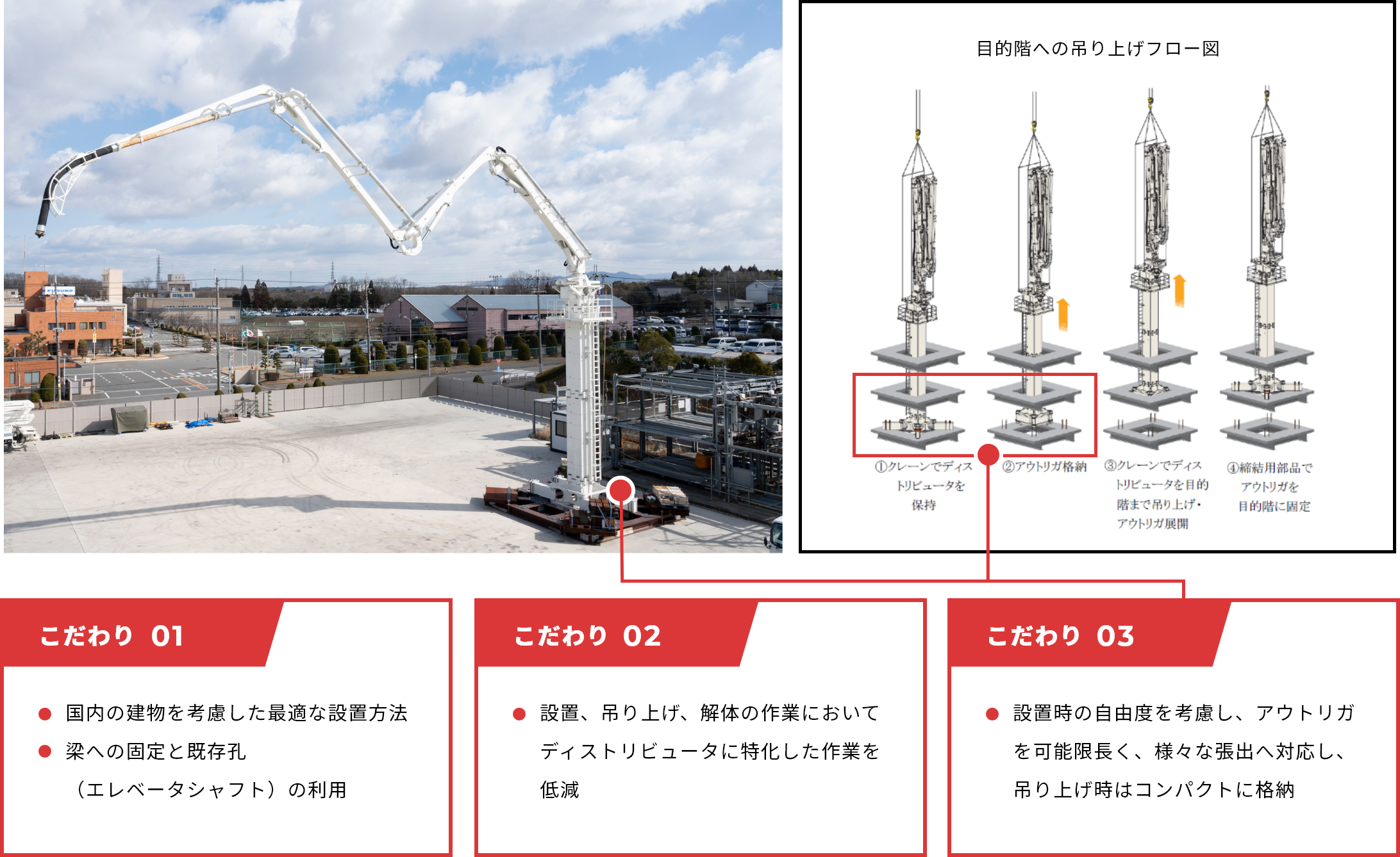 これまではコンクリートポンプ車のブーム装置が届かない高層階では、配管の敷設作業など人力での作業が必要でした。配管の敷設作業は、本当に時間と労力を要する大変な作業なんです。