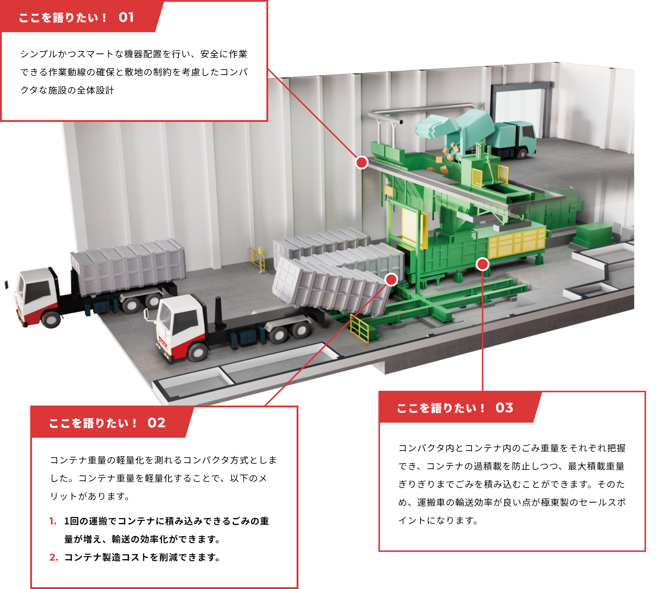 一般廃棄物の広域処理の一環として、可燃ごみを効率的に運搬するため、当社のコンパクタ装置で圧縮し、専用車両に積み替える施設の建設が求められました。